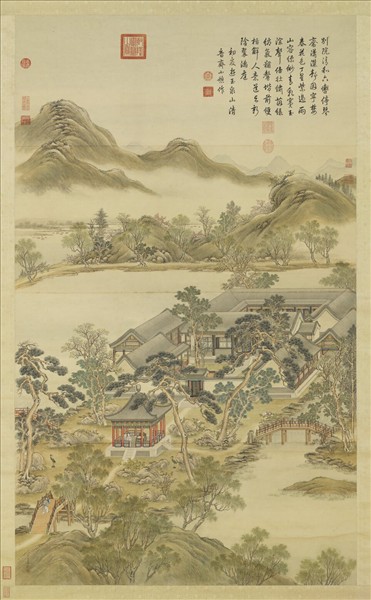 此作原屬「十二禁籞圖軸」之一,為雍正、乾隆朝宮廷畫家沈源所繪。題稱「中呂(仲呂)」是音樂十二律之一,古人將十二律用於曆法,依照《禮記》記載,仲呂即為孟夏之月(四月)。此作無年款,據檔案記載,知是乾隆十三年(一七四八)選御製詩十二首,命四位畫家各創繪三幅而組成。此幅御製詩寫初夏遊玉泉山清音齋,即靜明園內一景。畫中既繪清音齋,更寫園中繁花盛開,以符合詩文意境。(20120408)