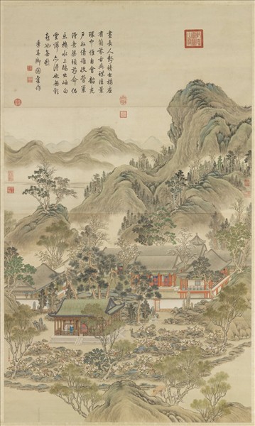 根據《石渠寶笈三編》記錄,此畫原屬《十二月禁(禦)圖》之三月景軸,《姑洗昌辰》是依題籤所錄,「姑洗」是引用古樂十二律之名。這套十二月景,分別由乾隆時期院畫家丁觀鵬、周鯤、余省、沈源等各畫三軸而成,皆題有乾隆詩作。 余省,生年據研究推測在三十一年(1692),卒年不詳,應在乾隆三十二年(1767)以後。擅長花鳥、魚禽等,師蔣廷錫。 此圖畫一山林下居所,根據建築物的佈排與經營奇巧的疊石庭園,應是圓明園後湖東南角一小島,畫面前半部是一閣台,原稱「牡丹台」,是帝王賞牡丹的場所,乾隆九年改稱「鏤月開雲」,用以紀念十二歲的乾隆在此地賞花時,初次見到祖父康熙皇帝之事。這棟香楠木築成的殿閣規模不大,但屋瓦是以黃藍兩色琉璃相間拼成,相當講究。後半部為另一組建築,正是乾隆御題「晝長人靜讀書樓」的「養素書屋」讀書處,庭中種有玉蘭,也是展示蘭花的地方。(陳韻如)