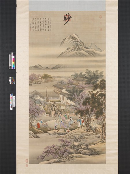 冷枚,生卒年不詳,作品見於康熙四十年至五十七年間(西元一七0三-一七一八年),膠州(今山東膠縣)人。字吉臣,號金門外史,一作金門畫史。焦秉貞弟子,善畫人物,尤精仕女。 園中桃花盛開,紅白競艷,士人圍桌而坐,侍者隨侍在側。全作著色穠麗,筆墨工整,綴景屋木,繪製精謹,仿如界畫,仍未脫畫工描摹刻畫之行跡。