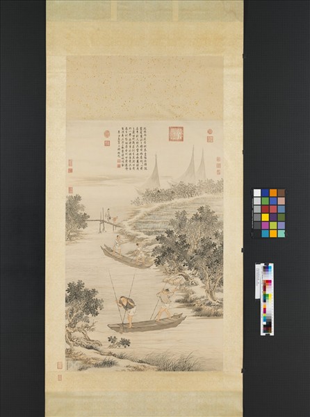 金廷標字士揆,浙江吳興人。善人物,兼工花卉、山水。乾隆南巡,進白描羅漢冊,稱旨,召入內廷供奉。生卒年未詳,作品見於西元一七六○–一七六七年間。 畫村民於河流中挖泥,既可以之糞用,又可濬通河水。因此乾隆皇帝嘉賞金氏畫意,而題詩云:「工執藝諫誠堪取。」。畫人物、舟船,頗有浙派筆意。
