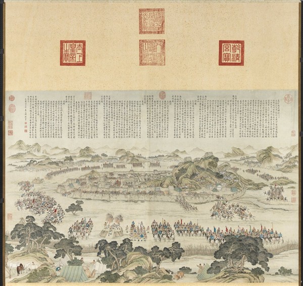 張廷彥(一七三五-一七九四)乾隆朝供奉內廷。工人物。 烏什今新疆阿克蘇和喀什噶爾之間,為回部適中之地。依山築城,有險可恃,田饒水足,物阜民豐。乾隆乙酉(一七六五)二月,小伯克賴黑木圖拉聚眾叛,清廷派軍圍攻六月,亂事始平。本幅描繪清兵攻城,兩軍交鋒的情形。布局森然,筆法精緻,故雖千軍萬馬而不顯紊亂。
