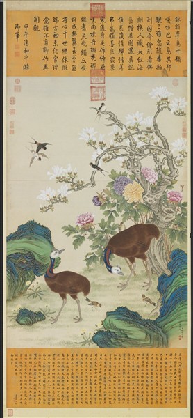 楊大章,乾隆時供奉內廷。根據御製詩及「御製額摩鳥記」得知,乾隆認為此鳥最早由荷蘭人於西元一五八七年得之於某海島,後有人於印度購之送給佛朗機亞(今葡萄牙)國王,國王並命工詳圖其狀。關於此珍禽有種種不實傳說,乾隆於三十九年(西元一七七四年)由番舶得之,一一驗證駁斥,並於同年要求畫家補繪入現在同時展出的「鳥譜」中。這種鳥可能是產於澳洲及新幾內亞島附近的食火雞。