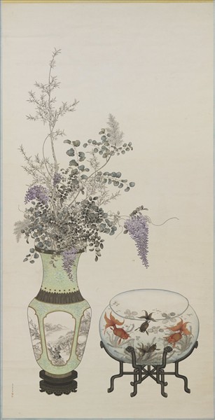 陳兆鳳的生平里籍猶待考查。 這是一件描寫宮廷中擺設的巨幅大畫。精美的彩瓷瓶上,插著紫藤、碧桃 等顏色繽紛的花卉植物;玻璃魚缸內,則畫著悠游在浮萍、水草之間的四條金魚。畫花卉以寫生的手法,中規中矩,一筆不茍,與花瓶紋飾之細緻工筆,搭配和諧。 宮廷畫家為美化宮廷生活的主要參與者,製作繪畫供皇宮懸掛是他們的主要工作。陳氏或許是服務於清宮內廷的畫家。