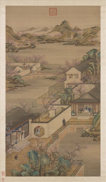 十二月令圖為清代前期院畫家所繪,無作者署名,共十二幅,內容為宮廷成員在圓明園歡度十二月分節令的情景。 圖畫二月紅白杏花盛開,上為女眷起居處,有的園內盪鞦韆嬉遊、有的室內賞景,前方建築為男仕休閒處,有展卷讀書、有品茗清談,男主人則佇立池畔沉思。庭院一角,茶僮爐前煽火煮茗,另一人則手托茶碗,準備奉茶。茶爐上置一紫砂壺,茶盤上則準備帶蓋茶碗。