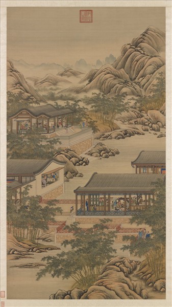 時序進入十月,已到初冬時節,嚴寒的霜露把人們的活動從戶外感到室內來。於是賞玩卷軸名畫,鑑定古器彝鼎等活動,便成文人室內聚會的話題。另一間廂房內,有一位老畫師正替一位士人畫像﹔遠處的閣樓內婦女群聚玩樂,有彈奏樂器、縫製衣物,或對坐談天,將富豪人家生活情景描寫得寧靜安逸。