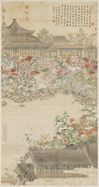張若靄(西元一七一三-一七四六)清安徽桐城人。字晴嵐,雍正癸丑(一七三三)傳臚。襲伯爵,諡文僖。善書,工畫花竹、禽蟲,深得王穀祥、周之冕遺意。 秋卉盛開,有雞冠、秋葵、雁來紅、菊、紅蓼、鳳仙等,麗色繽紛,芬芳滿庭。畫家為強調群芳爭妍,因略去建築與花卉之客觀比例,然宮室仍以界畫,並摻用透視法工筆描繪。畫成於乾隆十一年(一七四六)。