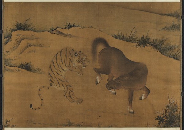 虎馬相鬪,虎欲撲,而馬則舉後腿以待敵。畫馬及背景,與明宣宗馬上像頗有近似處,可能亦為明人院畫。