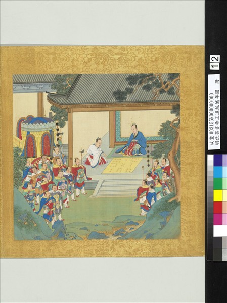 《尚書》〈洪範〉記載,周武王拜訪智者箕子,請教治國之道。箕子引用上帝賜給禹的九類大法(洪範九疇),即世傳洛水出現的神龜所負的九種圖形,向周武王一一講述治理國家的九種常理。圖中周武王坐於廳堂中央,箕子在側,以手指著地上的九個圖形,堂室外侍從分站兩列,如戲劇舞臺,讓觀者清楚看到主角的活動。