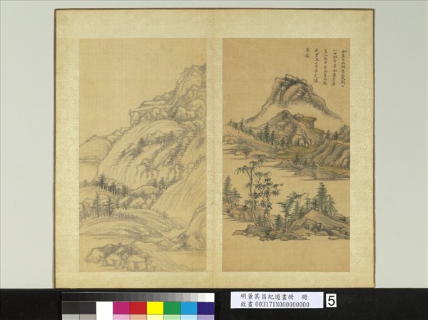 第五開左幅,此開畫幅山體構成與〈富春山居圖〉的中段山體十分相近,無論用墨皴筆,乃至於草木樹法等都與之相似。董其昌在京師期間(1589-1595)見黃公望〈富春山居圖〉,並於萬曆二十四年(1596)購得。董其昌曾自稱於二十多歲開始習畫,並以黃公望風格為主要學習對象。因公務往來京師、江南等地,順途觀覽、搜訪古書畫作品,為其書畫風格奠定豐厚基礎。(董其昌紀遊畫冊 第五開左幅 20110609)