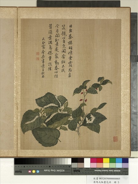 馬元馭,字伏羲,號棲霞,又號天虞山人。江蘇常熟人,生在聖祖康熙八(公元一六六九)年,死在康熙六十一(公元一七二二)年。擅長花鳥畫,由於早年親得惲壽平教授,後又和蔣廷錫相互討論繪畫六法,所以又以沒骨花卉最見長。王翬曾稱譽他的作品,認為是「神韻飛動,不泥陳迹」。 本幅畫蠶棲於桑葉之上,並已有化為蛾者。設色柔麗,蠶之蠕動,蛾之振翅交尾,皆極逼真,本幅選自「畫花卉冊」之第五開。