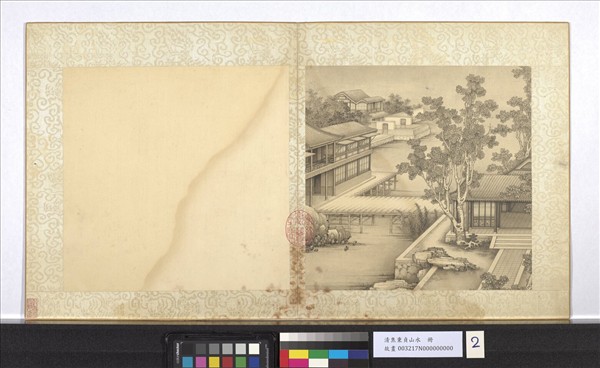 焦秉貞(約活動於一六八九至一七二六年)字爾正,山東濟寧人。康熙時任職欽天監五官正,與歐洲傳教士南懷仁共事,是康熙畫院中最早受到西洋畫法影響的畫家之一,亦是乾隆畫院有是新進西洋傳教士畫家所學習的對象。此冊頁採單點透視法融入清式民居建築中,數進屋宇院落自大至小,曲盡其致。園中門洞目的是構成景框,使園景產生特殊外貌。第二開繪秋景,梧桐、桂樹、蘆葦點綴圖中,後方繪有卷棚帶抱廈屋頂,(前後相接處不用屋脊,而做成弧線曲面。)進深三間前出廊;前方合瓦懸山屋面,檐下有支摘窗,(多用於園林建築或住宅,大式小式建築均可。外層上段可支起以利通風,下段可摘掉以利採光,窗心都是櫺條。)下為磚砌檻牆,蓋在厚木板鋪成的橋面上。右邊另一棟建築物四周有檐廊,北方稱為格扇門,格心紋樣為「一馬三箭式」,(直櫺窗的一種,在縱列直櫺上下部位,各橫置三根橫條。)為明清宮殿的次要房屋常用,下方條環板與裙板都用彩畫大理石紋裝飾。灰瓦白牆沒有奇巧華麗的房子,而小木作裝修卻儘量求變化,走細膩精緻的路線。此畫乃利用透視滅點法畫成,根據圖中透視線斜度的變化可推求出其滅點的準確位置。屋瓦、屋檐、廊柱、窗洞、橋樑、地面磚,皆運用淡墨渲染法,來區分建築物的明暗面,以加強其立體感。(林莉娜)