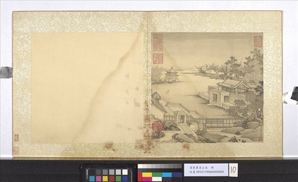 此為一套沒有紀年的水墨圖作,僅有「臣焦秉貞恭畫」款。全套十開皆描繪園林樓閣,針對建築物的描繪十分講究,特別運用比例大小的縮放來加強建築物的深度效果。畫中只有山水樓閣。全無人物活動,其中部份樓閣的布景與〈十二月令圖〉的部份場景十分接近,本套冊頁或許正是一些清宮樓閣山水作品的圖稿。焦秉貞的生卒年不詳,活動記錄最晚約到雍正朝,然在乾隆朝初期仍有被當作畫樣使用的記錄。