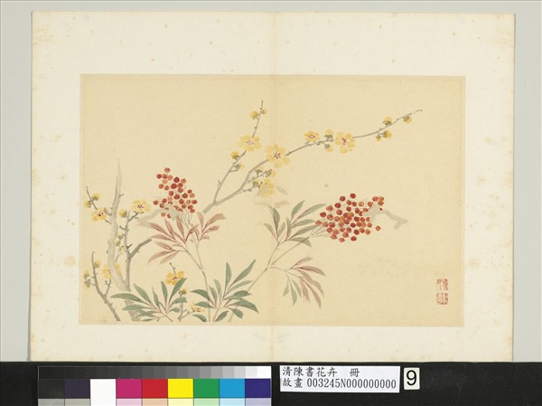 陳書(西元一六六0至一七三六年),浙江秀水人,號上元弟子,上元老人。適海鹽錢綸光,後以長子錢陳群顯貴,誥封太淑人。 本幅畫天竹子、臘梅,成畫於康熙癸己(西元一七一三)年,時年五十三歲。