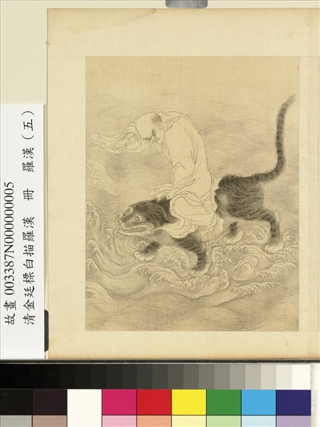 金廷標(活動於西元一七六0–一七六七年),烏程(今浙江湖州)人,字士揆。工人物、花卉。乾隆南巡時,進「白描羅漢冊」,遂得供職內廷,頗得高宗讚賞。廷標喜用挺健之筆,近唐寅畫風,在盛清宮廷畫家中別具一格。 本幅為「白描羅漢」冊之第五開,畫一羅漢,騎馭猛虎,行於波濤之上。羅漢雙目賁張,一手握拳,神情栩栩如生。全作純以白描鉤勒,衣紋轉折頓挫,簡勁有力。