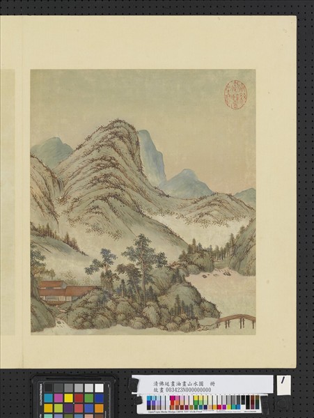 依據活計清檔,從郎世寧學習的宮廷畫家有烏林人佛延,此套冊頁作者題為佛延,是否即是曾與郎世寧習畫者待考。然本冊以油彩繪在紙上,畫法雖是傳統山水技法為主,但是畫樹部份則有光影明暗的處理效果,且因油彩作畫色調與中國畫風效果相異,別有一番趣味。此套冊頁有八開,此次展出其中三開。