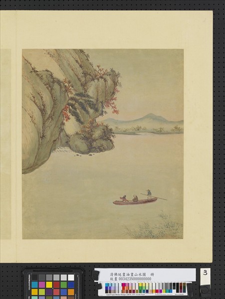 依據活計清檔,從郎世寧學習的宮廷畫家有烏林人佛延,此套冊頁作者題為佛延,是否即是曾與郎世寧習畫者待考。然本冊以油彩繪在紙上,畫法雖是傳統山水技法為主,但是畫樹部份則有光影明暗的處理效果,且因油彩作畫色調與中國畫風效果相異,別有一番趣味。此套冊頁有八開,此次展出其中三開。