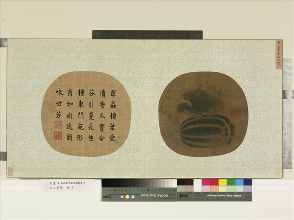 瓜果熟透,引來覓食的螽斯(又稱紡織娘),其生產力旺盛;瓜果多子,瓜葉、瓜鬚為蔓生植物,能綿延生長,故此畫蘊含有「祝願子孫眾多」的吉祥寓意。 瓜皮用老綠染,瓜稜填以赭黃,裂縫則以石綠淡染。瓜葉邊緣已枯殘,亦用赭黃漬染。本院所藏宋韓祐(活動於西元一一三一─一一六二年)「螽斯綿瓞」與此圖構圖書法相似。 本幅選自「宋人集繪」第三開。