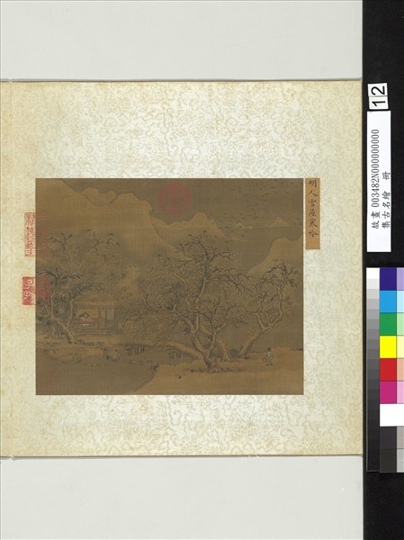 枯林群鴉,茅舍板橋,灰黯的河床和天色,襯托出遠山、近坡和樹枝上的皚皚白雪,構成一幅寒冷的冬景。畫中童子攜壺走來,主人伏案尋思,書几淡淡的朱紅色,似乎為這片寂寥肅穆的景致,憑添一絲暖意。 這幅畫沒有作者的款印,從細碎的筆法,及淡墨渲染表現朦朧氣氛的作風來看,似是出於明代後期松江派畫家之手。 本幅為「集古名繪」冊第十二開。
