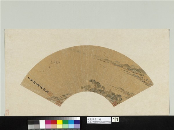 大江寥闊,帆檣飛駛,雁字聯空。著筆無多,而無畫處是畫。款:「己亥仲夏」,是年徵明七十歲。