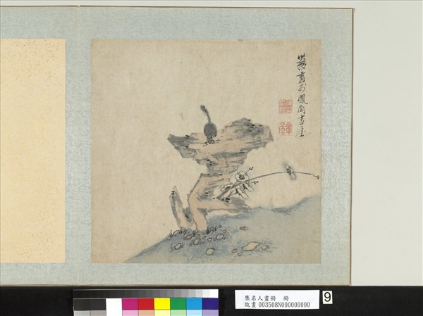 陳洪綬(西元一五五八-一六五二年),字章侯,早年自號蓮沙彌,後號老蓮。明亡後,又號悔遲、勿遲。浙江諸暨人。人物、花鳥、草蟲、山水無不精妙,皆能自出機杼,表現高古奇駭,意趣盎然之特色。為晚明極具影響力之大畫家。 嶙峋奇石,有梅一枝從旁側出,石上一隻松鼠,似在啃囓著,形態生動而可愛。通幅著筆精簡。構圖造型均有樸拙之趣。 本幅為「集名人畫冊」第九開。