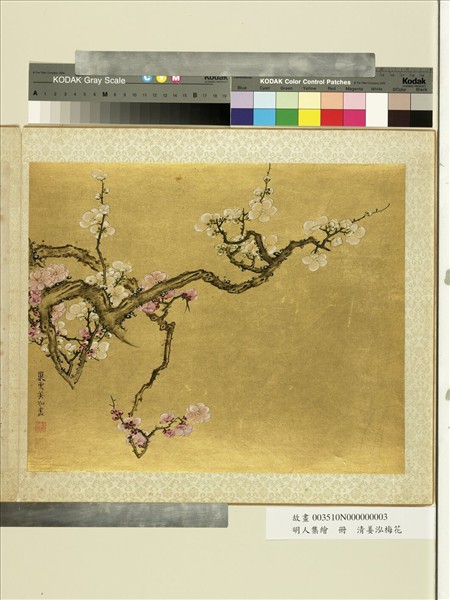 姜泓,畫史無傳,生卒年籍貫均不詳,以畫風論,應當清朝的人。畫梅花,圈瓣、填粉、點蕊,一一出於寫實手法,精細整飾,極得老梅的情狀,惟因畫在金地,強光反映微損色度。