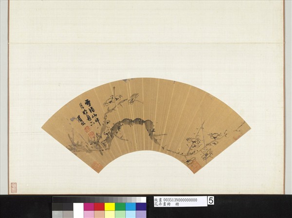 陳繼儒(西元一五五八-一六三九年),江蘇華亭人,字仲醇,一字眉公,號糜公。天賦多智,少有高才,詩文書畫皆所善長,與同郡董其昌齊名。畫擅水墨梅、竹,山水亦氣韻空遠。董其昌嘗評之:「雖草草潑墨,而一種蒼老之氣,豈落吳下畫師恬俗魔境。」眉公亦自言:「若著色相尚,便與富翁俗僧無異。」「疏枝橫玉」為「明花卉畫冊」第五幅,於泥金箑面上,純假水墨揮掃枝幹蕊萼,筆筆不重形色,然益能顯現寫意花卉之雋永情趣。直可以「所作皆在筆墨畦徑之外」許之。