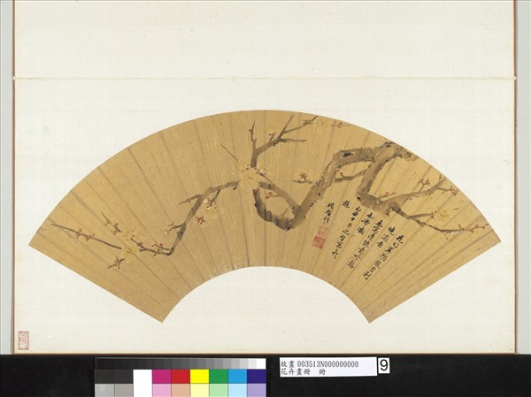 項聖謨(西元一五九七-一六五八年),秀水(浙江嘉興)人。字孔彰,號易庵,又號胥山樵,別號松濤散仙、存存居士。乃元汴孫,家貧志潔,每鬻畫以自給。畫善山水、人物及花卉,俱因風格清雋,致能贏得士氣、作家兼備的令譽。本幅屬「明花卉畫冊」第九開,金箋本,幅中枝椏殆用赭墨揮寫,梅瓣則假白粉漬染,再以朱標畫蕊、汁綠點苔,并輔以詠詩佈白,致令全畫饒具色澤明麗,與詩情洋溢之美。