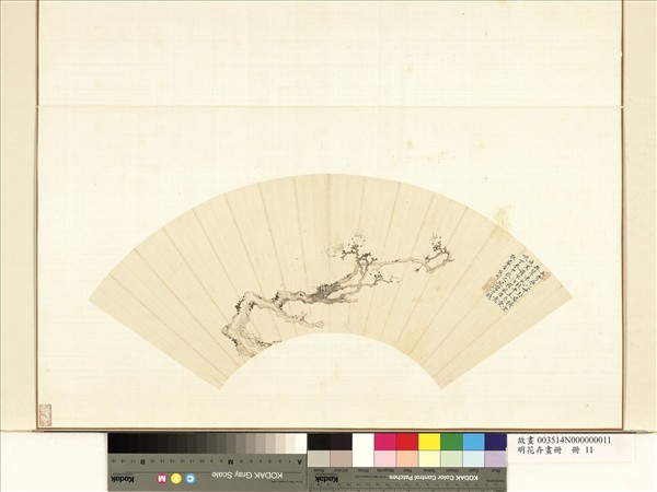 金俊明,生在明神宗萬曆三十(公元一六0二)年,死在清聖祖康熙十四(公元一六七五)年,江蘇吳縣人,初名袞,字九章,後改名俊明,字孝章,號耿庵,自稱不寐道人。出身諸生,曾參加復社,天性孝友,為人修行純潔,經史百家天文水利無所不讀,才名藉甚,詩詞文章外,又善書畫,畫中能山水、竹、石,而以墨梅最出名,前人批評為「蕭疏有致」,以其與宋末鄭思肖的墨蘭相比擬。   本扇面畫於六十五歲時,老幹虯枝,素花如雪,全得梅花疏傲之致。