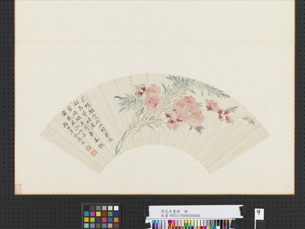 惲壽平(西元一六三三-一六九○年),初名格,字壽平,後以字行,又字正叔,號南田,別號雲溪外史,東園草衣。武進(今江蘇常州)人。初善畫山水,力主復古,及見王翬自度不能過,於是捨而學花竹、禽鳥。以徐崇嗣沒骨花卉法為宗,獨開生面,創常州派。   本幅以沒骨寫生法畫桃花柳葉,取胭脂分染花瓣,花青加藤黃點畫柳絮。紅花襯以綠葉,設色雅緻生動。畫面上的經營位置,賓主有序,細枝茂葉,花朵繽紛,滿紙春意盎然。本幅為「清花卉畫冊」第九開。