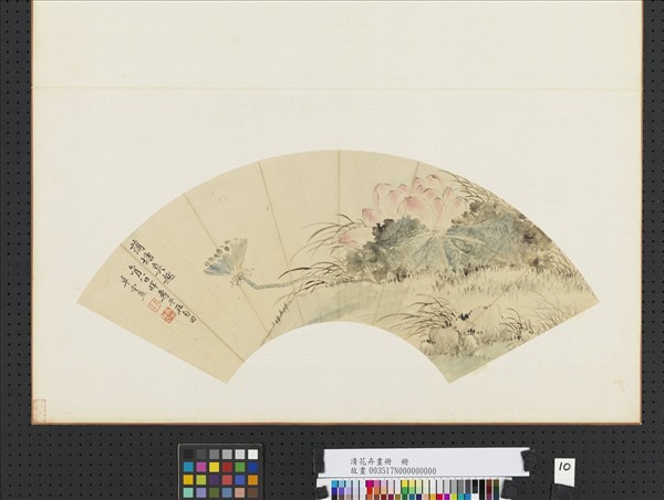 惲壽平(1633-1690),原名格,字壽平,後以字行,江蘇武進人。初善作山水,因自謙無力與王翬(1632-1717)爭勝,遂改工花卉。畫法承自徐崇嗣(10世紀後半)之沒骨法,又參以己意,風格獨創,蔚為清代花卉畫宗師。   本幅選自<清花卉畫冊>,筆墨較為疏朗,帶有放逸的趣味。自題「蒲塘真趣」,以小景式構圖方式畫蘆葦塘邊實景,但見前有坡地,後荷之花葉半出,然一蓮蓬向左挺伸向上,打破荷與坡地均分畫幅右半的局面,使畫面有了律動感,活潑起來。(20110102)