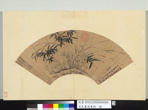 文徵明(西元一四七○至一五五九年),江蘇長洲人。初名壁,字徵明,後以字行,又字徵仲,號停雲生、衡山居士。詩文書畫并佳,為明四大畫家之一,畫師沈周,而別有造詣,影響明朝晚期畫風甚鉅。  本幅寫蘭、竹於荒野荊刺叢莽間,頗具清致。選自文徵明畫扇冊。