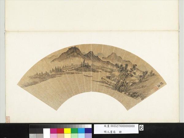 錢穀(西元一五○八─一五七八年)字叔寶,號罄室,吳縣(今江蘇蘇州)人、少孤貧,失學,壯歲始知讀書,家無典籍,遊文徵明門下。山水爽朗可愛,花卉蘭竹兼妙,善書,可惜為畫名所掩。 淺設色畫遠山三疊,越遠越淡,近景小舟一艘,房舍之間,屋內書生一人,攤書閱讀,點出題意所在。通幅構圖嚴謹,設色淡雅,筆墨精簡,堪稱佳作。 本幅為「明人畫扇」第六開。