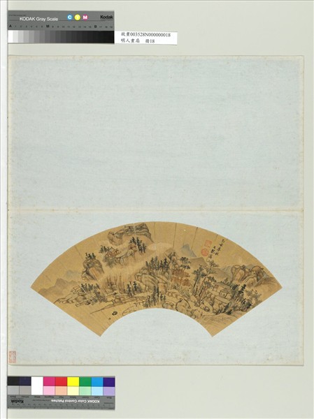 莫是龍(?-西元一五八七年),華亭(今上海松江)人。得米芾石刻雲卿二字,因以為字,後又字行,又號秋水。工詩古文辭,書法鍾繇、二王及米芾,畫山水宗黃公望而另得蹊徑。   本幅以淺絳色出之,構圖繁而不亂,山石間多礬頭,疏林散布。用筆蒼勁雄偉,房舍、涼亭、寺廟。信筆畫之,林間山嵐環繞,煙霧迷漫,通幅用筆使墨,頗能得黃公望之精神。畫有乙亥款,完成於西元一五七五年。   本幅為「明人畫扇冊」第十八開。