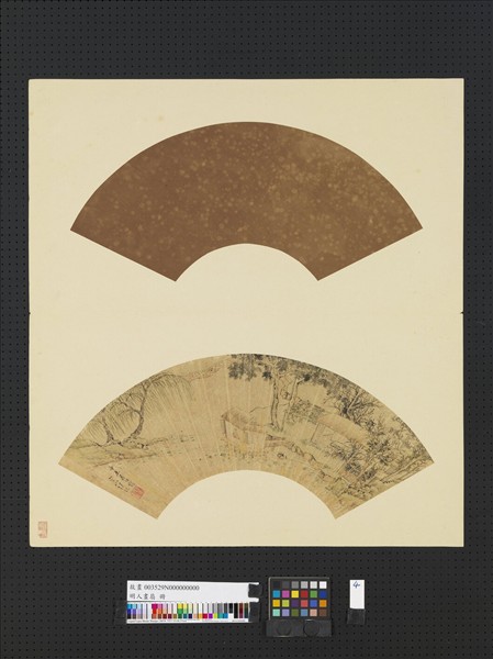 陸治(西元一四九六-一五七六年),吳縣(今江蘇蘇州)人。字叔平,號包山子。好為詩及古文辭,善行楷,尤精通繪事。遊祝允明、文徵明門,其於丹青之學,務出其胸中奇,一時好稱。山水喜倣宋人,而時出己意。荷塘一區,上築水榭,高士臨窗賞花,前有柳、後有梧桐,又棚架藤花,皆是夏日景致。俯視構景,重右而略左,上方復出一平坡,三面環繞,布局頗為別緻,款署辛未(西元一五七一年),時年七十六歲。惟此款,似不類陸書。本幅為「明人畫扇」冊第四開。
