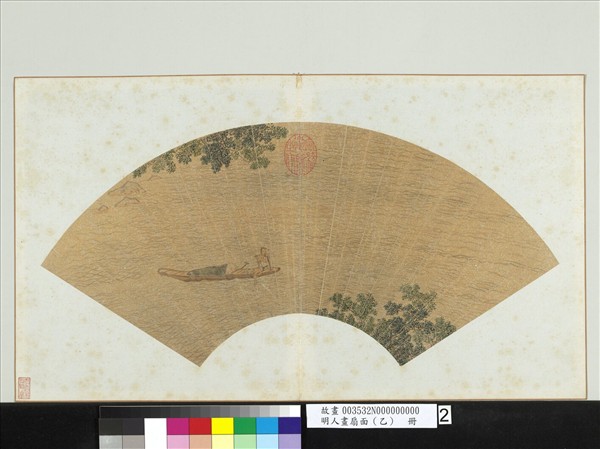 本幅選自「明人畫扇面」冊。畫上未繫作者款印,據風格推定為仇英。 通幅構景至為單純,淺設色畫盛夏夜景,江上小舟隨波搖蕩,舟中人露胸坦臂,橫笛吹奏,一足探入水中,神情逍遙。水中映有月影,江面浩瀚,波光粼粼,襯著灑金的箋紙,備覺耀眼醒目。水波用筆,於率意中不失法度,人物亦精工不刻板,應屬仇英後期之作。