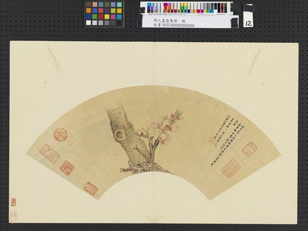 陳洪綬(西元一五九八-一六五二年),字章侯,號老蓮,浙江諸暨人。在科舉上不成而絕意功名,花鳥人物裝飾性重,曾為版畫起稿,作插圖紙牌。本幅畫桃花,老幹連雲,下出一枝,繫以彩帶。畫成於壬戌(一六二二),二十五歲之時。詩中意似扇主曾有綺遇,而囑洪綬寫此花為贈者。洪綬早年花鳥寫生師法藍瑛,本圖尚有其師面目,為院藏最早陳氏畫作。  本幅選自「明人畫扇集冊」第十二開。