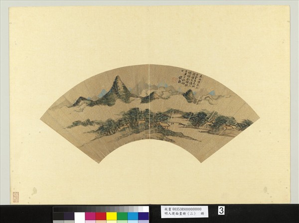 錢穀(西元一五0八─一五七八年),江蘇吳縣人。字叔寶,號磐室。少孤貧失學,及長,遊文徵明門下,讀書之餘,兼習繪畫。山水、人物、花鳥俱擅長。山水以筆墨爽朗見長,放縱之處甚於文徵明。  春山白雲,溪岸人家。前景叢樹濃蔭,間有房舍,林後山腰為雲帶隔斷,遠峰橫列,以橫筆「米點」疊繪而成。其中樹、山皆先用墨筆橫畫,再點汁綠,後罩石青。層層點染乃學米氏雲山法,而鮮麗的石青設色,則於墨點堆砌外,另有一番異趣。本幅為「明人便面畫冊」第三開。