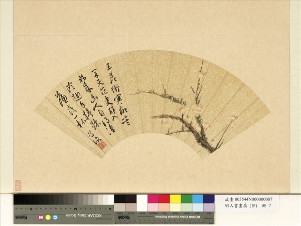 陳淳(西元一四八三-一五四四年),江蘇長洲人。字道復,別號白陽山人。精於經學、詩文、書法、篆籀,又好繪事。早歲曾遊文徵明之門,中年以後畫風轉變,以寫意花卉及米家山水著稱。   本幅為「明人書畫扇卯」冊第七開,設色畫紅梅一枝,用沒骨法,筆意極稱活潑、妍雅,所惜顏料日久褪色,故覺稍淡,然無損於梅枝高潔之清氣也。