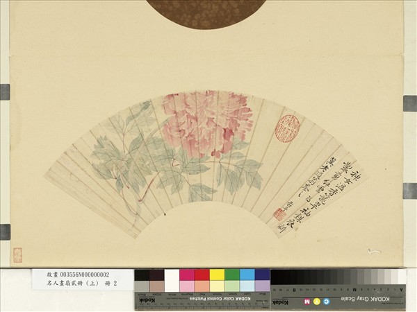 惲壽平(西元一六三三-一六九○年),江蘇武進人。初名格,後以字行。詩格超逸,書法得褚遂良神髓,遒逸可愛;畫筆生動,時稱「三絕」。畫初學山水,後自覺無力與王翬爭勝,乃專攻花卉,以徐崇嗣沒骨法參以己意,創立獨特風貌,成為清代花卉畫宗師。 本幅為「名人畫扇貳冊」中一幅,沒骨寫牡丹一枝,色彩中含有豐富水份,故具透明澄澈之感,益覺清逸動人。