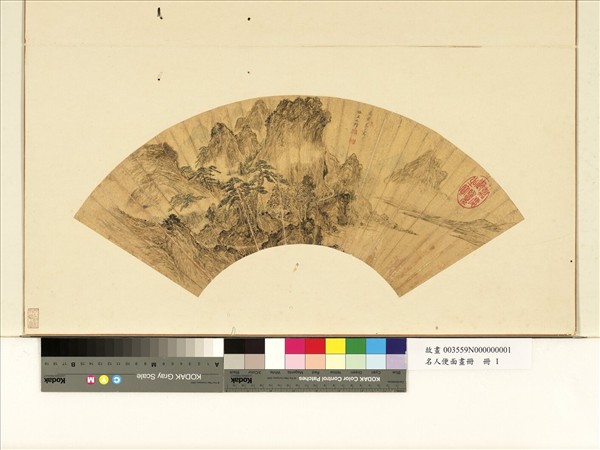 吳之琯(約活動於明萬曆年間),字汝廷,武進(江蘇常州)人。賦性蕭疏,巾而不櫛,清脩茹素,屢空晏然,望而知為山澤之臞。寫山水、人物、花鳥,博綜往哲,淹潤精工。山岩陡峭,棧道迂迴,道中行人或挑擔、或騎驢、唯妙唯肖。蒼松數株,染以花青。山石以碎筆乾墨皴擦,再用焦墨細皴,獨具特色。本幅為「名人便面畫冊」第一開。