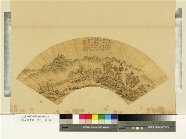 陸治(西元一四九六-一五七六年),吳縣(今江蘇蘇州)人。居包山,因號包山子。倜儻嗜義,以孝友稱。好為詩及古文辭,善行楷,尤精通繪事,書學祝允明,畫學文徵明。工寫生,得徐黃遺意,點染花鳥、竹石,往往天造。山水喜倣宋人,而時出己意。   蘋香楓色,雲起江潭。虛亭中,橋頭上之高士以減筆繪成。山石紋理,以方折筆墨寫之,筆調老辣,是陸治晚年之作。本幅為「明人畫扇-亨」冊第十四開。