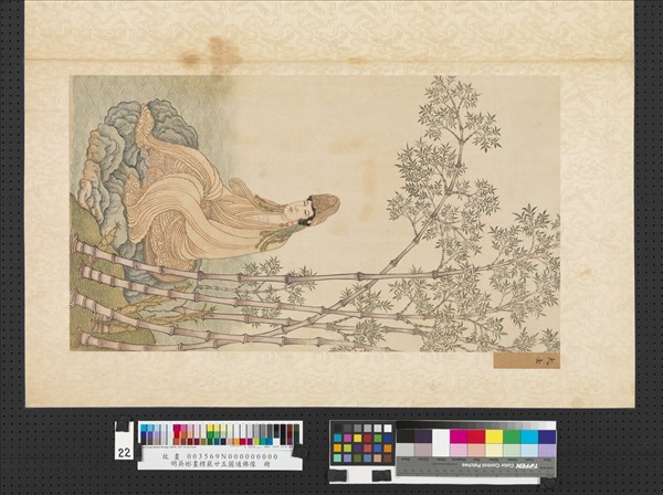 吳彬(活動於一五六八-一六二七),字文中,一作文仲,號質先。福建莆田人,後來遷居金陵(今南京)。擅長畫山水、花鳥、佛教人物。這幅大士像是「畫楞嚴廿五圓通冊」的第二十二幅,觀音菩薩頭披白巾,身穿白袍,面對河流結跏趺坐,身後的竹林茂密。全作的顏色清潤秀雅,人物形體拉長,衣紋線條流暢好像行雲流水一般,但卻似水波一樣的起伏,為這幅畫增添了不少變形的趣味。
