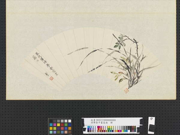 惲壽平(西元一六三三至一六九○年),江蘇武進人。初名格,字壽平,後以字行,又字正叔,號南田,別號雲溪外史、東園草衣等。初善山水,後來專攻花卉,以北宋徐崇嗣沒骨畫法參合寫生枝法,一洗時習,獨開生面,海內宗之。   採沒骨法畫著色蘭花,枝葉則以流利的筆墨線條為之。設色高雅,構景清新活潑,雖言學元代僧普明畫蘭之法,然自具面貌,別有逸韻。   本幅選自「惲壽平書畫扇」冊第四開。
