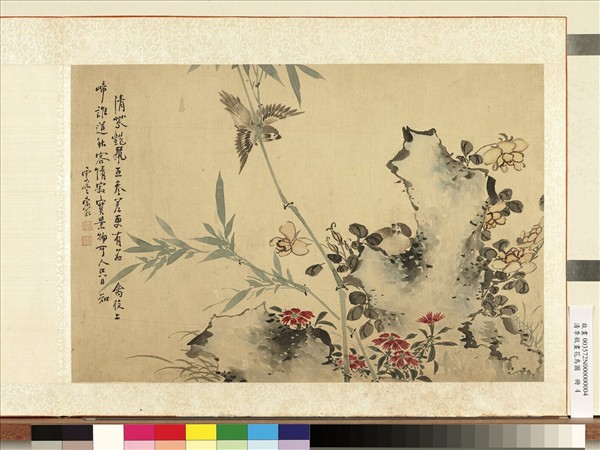 李敬,生卒年不詳。 本幅寫竹二枝,石旁薔薇、石竹叢生。麻雀一雙,一飛一棲石上,相互呼應。筆意疏放,頗有民初海上畫派之風。 本幅為「清李敬畫花鳥圖」冊第四開。