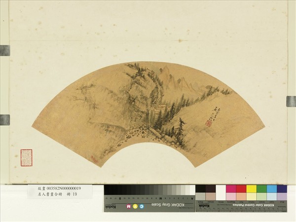 沈哲,約活動於明清之際,生平資料待考。兩峰夾峙,古寺深藏,中有溪水潺潺流出。景境幽深清靜。全圖善運用虛實之對比,兩峰以虛淡方式向左右擴延,中間為實處,翠谷古寺遂成焦點之所在,構景奇絕而新穎。本幅為「名人書畫合冊」第十九開。