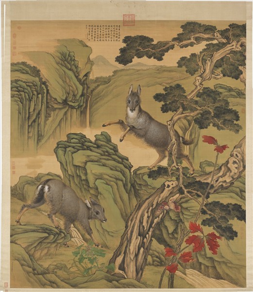 郎世寧(西元一六八八-一七六六年),義大利人。十九歲入天主教耶穌會為修士。曾習油畫,兼習建築。二十七來華傳教,以繪事供奉內廷。   本幅畫深山幽澗中,古柏曲似蒼虯,青羊二頭,一縱躍,一徐行,形神俱絕妙逼真。細審山石筆法、設色,較少西洋風格,應屬郎氏中晚期之作品。