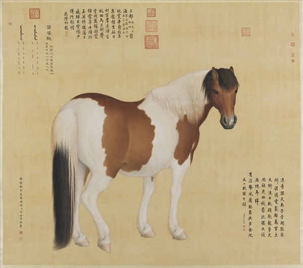 郎世寧(一六八八-一七六六)意大利人。十九歲入天主教耶穌會為修士,習畫與建築。二十七歲來華傳教,召入內廷供奉。善畫人物、花鳥,尤善畫馬。 郎氏奉敕寫生邊疆藩臣進貢之良馬,以與真馬近似之大小尺寸繪之,生動逼真。畫成於乾隆八年(一七四三)。