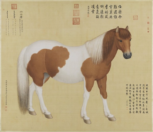 郎世寧(西元一六八八-一七六六年),意大利人,十九歲時,入天主教耶穌會為修士,早年曾習西畫與建築。二十七歲來華,以繪事供奉內廷,歷任康熙、雍正、乾隆三朝。善畫人物花鳥,尤擅犬馬。   郎氏奉敕寫生邊疆藩臣進貢之良馬,以與真馬近似之大小尺寸繪之,其畫於中國傳統畫法中,加入西洋光影透視法,故色彩穠艷,形象逼肖。本幅為十駿圖中之赤花鷹。畫成於乾隆八年(一七四三)。