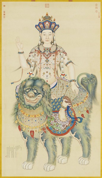 丁觀鵬(活動於西元一七三七-一七六八年間),乾隆時以善畫供奉於內廷。 本幅為五臺山文殊菩薩聖像的摹本。根據左下角作者的款識,乾隆皇帝於辛巳(一七六一)春巡幸五臺山,瞻禮文殊菩薩聖像。回鑾後,親自以水墨摹寫成圖,再命丁觀鵬設色,全作費時七個月才大功告成。乾隆皇帝自詡為文殊菩薩在世間的化身,親自摹寫五臺山的文殊菩薩法相,足證其對文殊菩薩有著特殊的宗教情感。