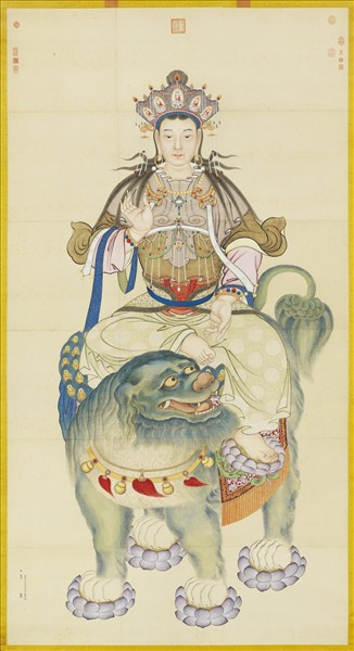 丁觀鵬,生卒年里均不詳。乾隆時以善畫供奉於內廷,精人物。嘗師法明末丁雲鵬筆意,但人物開臉暈染兼採西洋畫法,故形象突顯,神情生動。 本幅繪文殊菩薩頭戴五佛寶冠,騎獅而坐,法相莊嚴。設色明麗,繪製精謹,一絲不苟。由於兼採西洋光影法入畫,更增立體效果。據作者款識,此畫作於乾隆二十六年(西元一七六一)四月,當與是年春乾隆皇帝瞻禮五臺山文殊菩薩聖像一事有關。